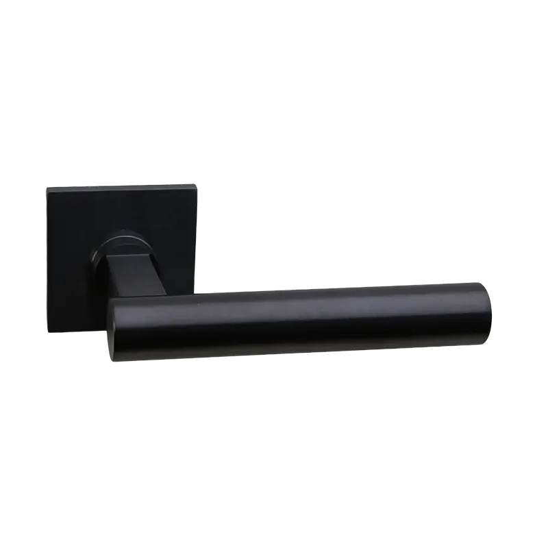 Deurkruk Bruxelles in carbon PVD. Deurkrukken worden per paar op dunne vierkante blind gemonteerde geveerde rozetten geleverd.