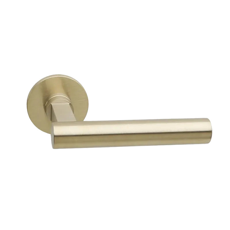 Deurkruk Bruxelles in matgoud PVD. Deurkrukken worden per paar op dunne ronde blind gemonteerde geveerde rozetten geleverd.