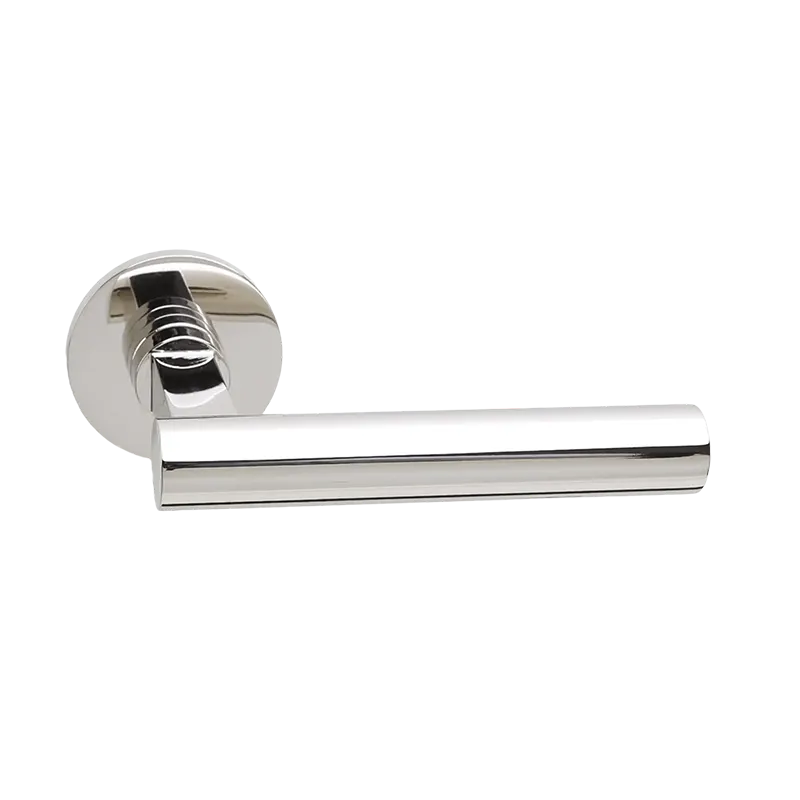 Deurkruk Bruxelles in hoogglans nikkel. Deurkrukken worden per paar op dunne ronde blind gemonteerde geveerde rozetten geleverd.