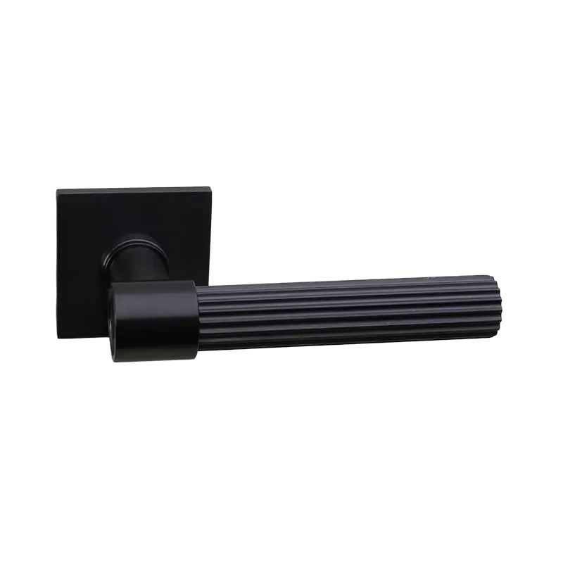 Deurkruk uit de modulaire serie bestaand uit basisstuk T-Bone met handvat Linear ( “Linear” tandwiel patroon) met carbon PVD coating. Deurkrukken worden per paar op dunne vierkante blind gemonteerde geveerde rozetten geleverd.