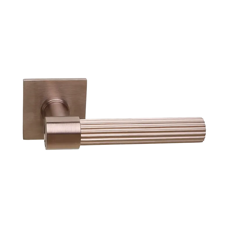 Deurkruk uit de modulaire serie bestaand uit basisstuk T-Bone met handvat Linear ( “Linear” tandwiel patroon) met mat bronzen PVD coating. Deurkrukken worden per paar op dunne vierkante blind gemonteerde geveerde rozetten geleverd.