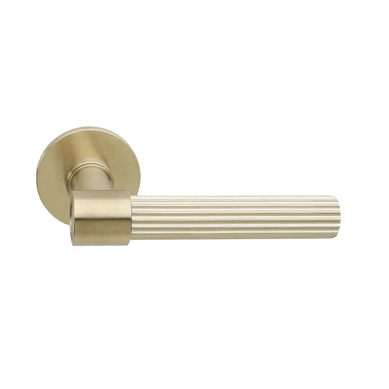 Deurkruk uit de modulaire serie bestaand uit basisstuk T-Bone met handvat Linear ( “Linear” tandwiel patroon) met mat gouden PVD coating. Deurkrukken worden per paar op dunne ronde blind gemonteerde geveerde rozetten geleverd.