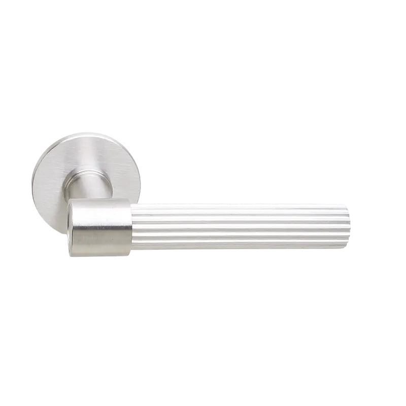Deurkruk uit de modulaire serie bestaand uit basisstuk T-Bone met handvat Linear ( “Linear” tandwiel patroon) in matnikkel. Deurkrukken worden per paar op dunne ronde blind gemonteerde geveerde rozetten geleverd.