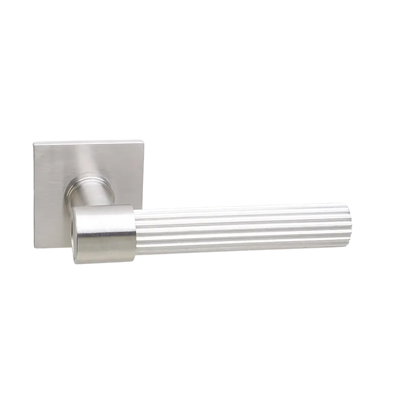 Deurkruk uit de modulaire serie bestaand uit basisstuk T-Bone met handvat Linear ( “Linear” tandwiel patroon) in matnikkel. Deurkrukken worden per paar op dunne vierkante blind gemonteerde geveerde rozetten geleverd.