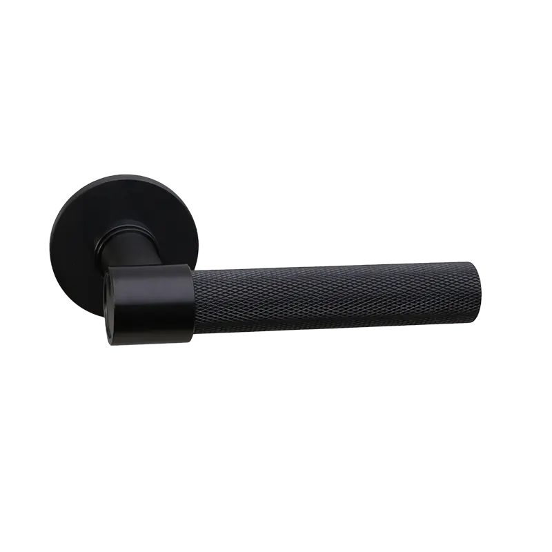 Deurkruk uit de modulaire serie bestaand uit basisstuk T Bone met handvat Struktur ( “Diamant Cut” ruitjes patroon) met carbon PVD coating. Deurkrukken worden per paar op dunne ronde blind gemonteerde geveerde rozetten geleverd.