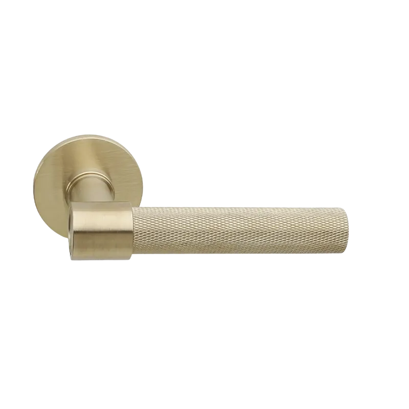 Deurkruk uit de modulaire serie bestaand uit basisstuk T-Bone met handvat Struktur ( “Diamant Cut” ruitjes patroon) met mat gouden PVD coating. Deurkrukken worden per paar op dunne ronde blind gemonteerde geveerde rozetten geleverd.