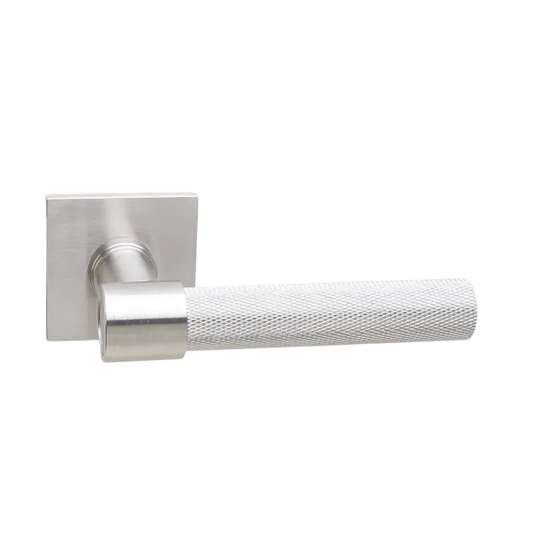 Deurkruk uit de modulaire serie bestaand uit basisstuk T-Bone met handvat Struktur ( “Diamant Cut” ruitjes patroon) in matnikkel. Deurkrukken worden per paar op dunne vierkante blind gemonteerde geveerde rozetten geleverd.