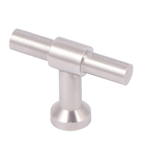 Elegante meubelknop in een T-model uit de T-bone serie gemaakt van rond massief geborsteld RVS, voorzien van extra pin en tape voor optimale bevestiging. Verkrijgbaar in 55mm x 40mm, 65mm x 44mm en 80mm x 49mm.
